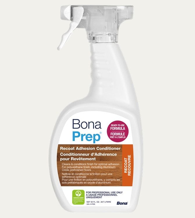 Bona Prep® is a ready-to-use, professional-grade recoat adhesion conditioner designed to clean and prepare polyurethane-finished hardwood floors—both site-finished and factory prefinished—for recoating. This 32 Oz solution removes surface contaminants, scuffs, and minor scratches, ensuring a strong bond between the existing finish and a new topcoat. It’s an essential step for flooring professionals and contractors seeking efficient, dust-free recoat preparation.